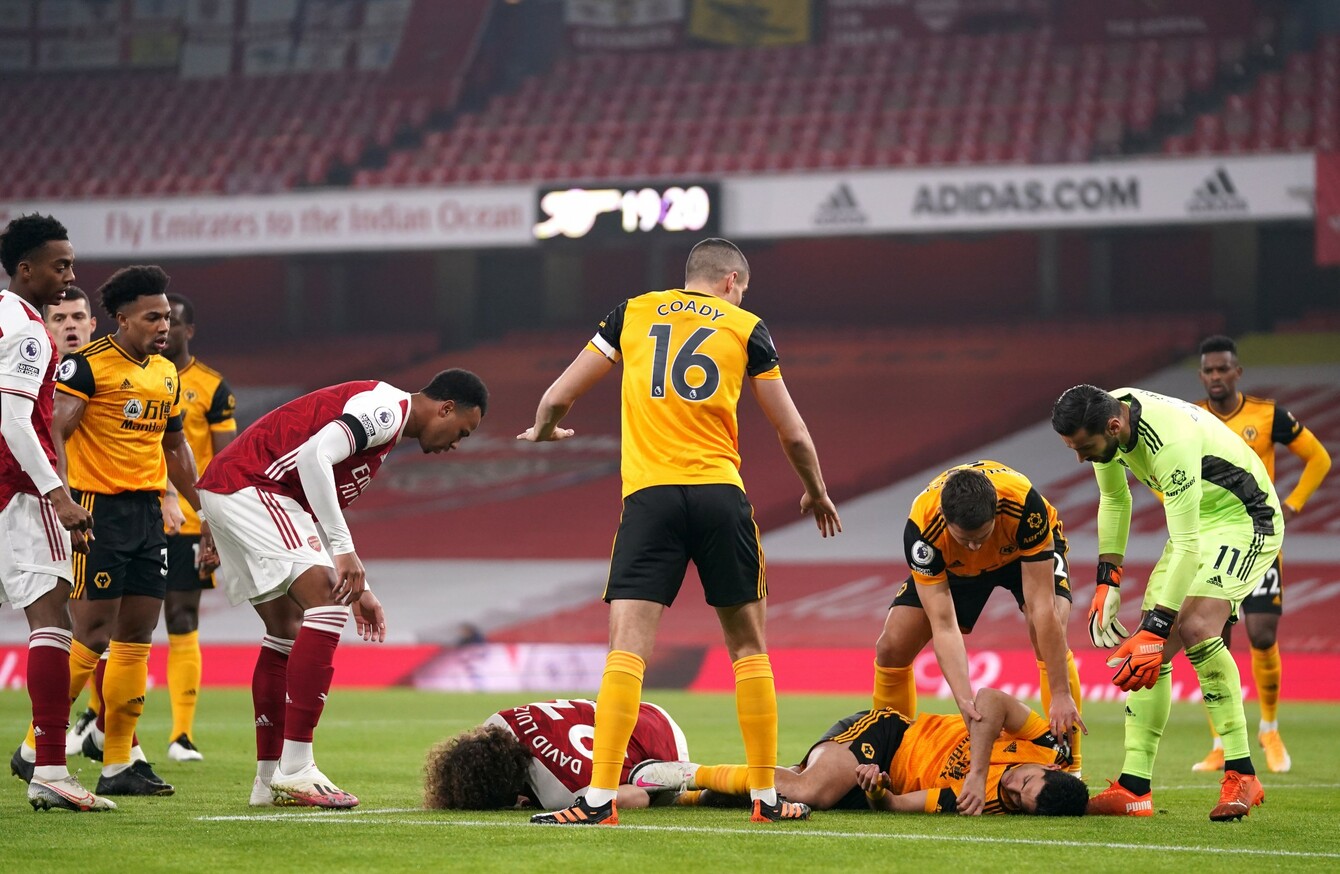 Wolves' raul jimenez was carried off on a stretcher after eight minutes of treatment on the pitch after colliding heads with arsenal's david luiz.